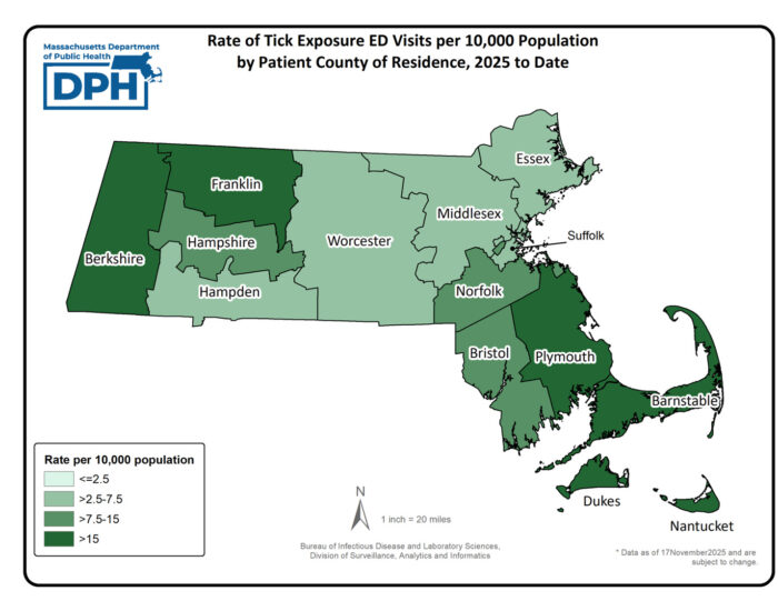 This map shows the rate, per 10,000 total population, of ED visits by patients who had a visit related to a tick exposure, by Massachusetts county of residence, 2025 to date. Although there are differences in the rate of patient visits, this shows that people are exposed to ticks throughout all of Massachusetts and should take recommended steps to reduce the chance of being bitten.